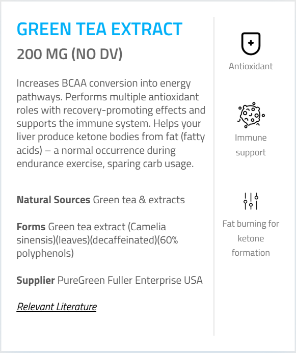 - Green Tea Extract (Camellia sinensis) (leaf) (60% polyphenols) (decaffeinated) – 200 mg