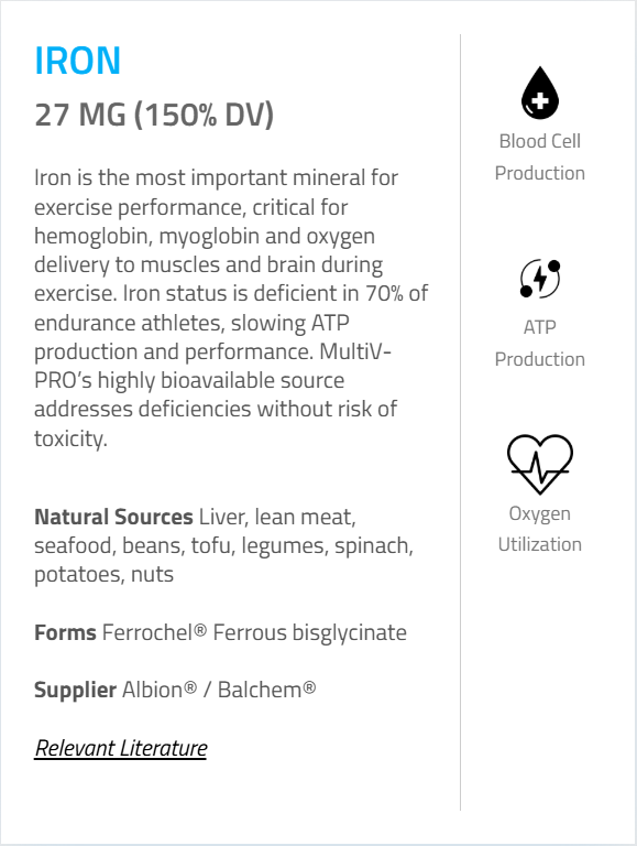 A: MultiV contains enough iron (18mg per serving) of an absorbable iron (Ferrochel®) to replete almost all endurance athletes, especially men.