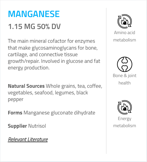 - Manganese (as Gluconate) – 1.15 mg (50%)