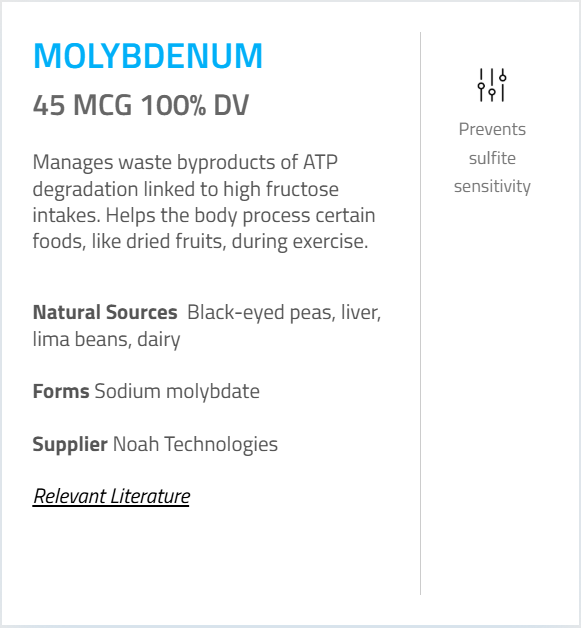 - Molybdenum (as Sodium Molybdate) – 45 mcg (100%)