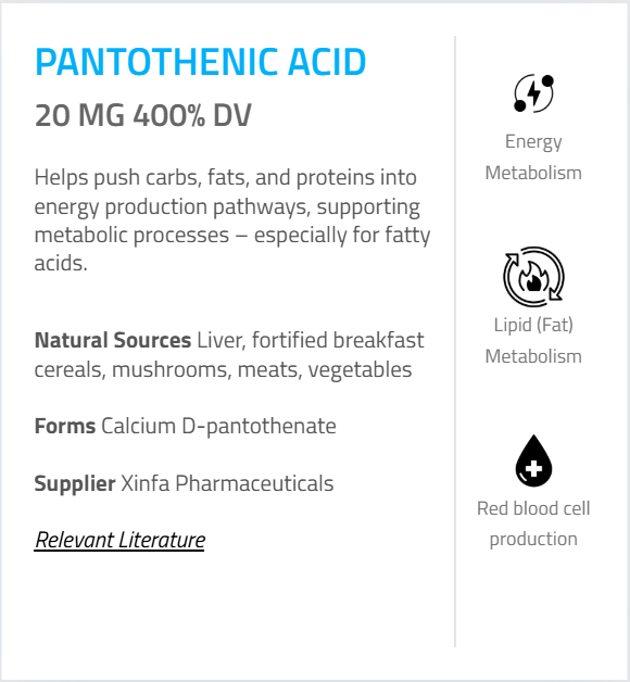 - Pantothenic Acid (as d-Calcium Pantothenate) – 20 mg (400%)