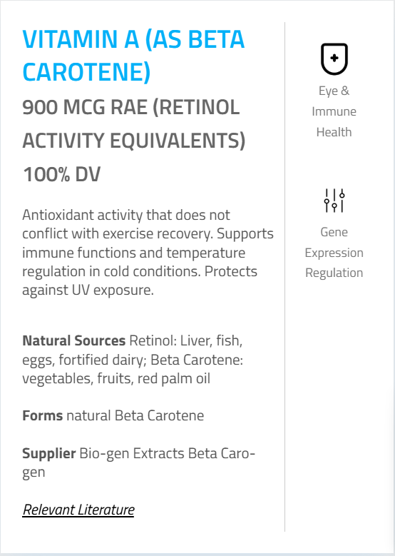 - Vitamin A (100% as Beta Carotene) – 900 mcg RAE (100%)