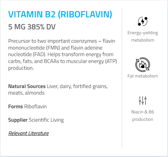 - Vitamin B2 (as Riboflavin) – 5 mg (385%)