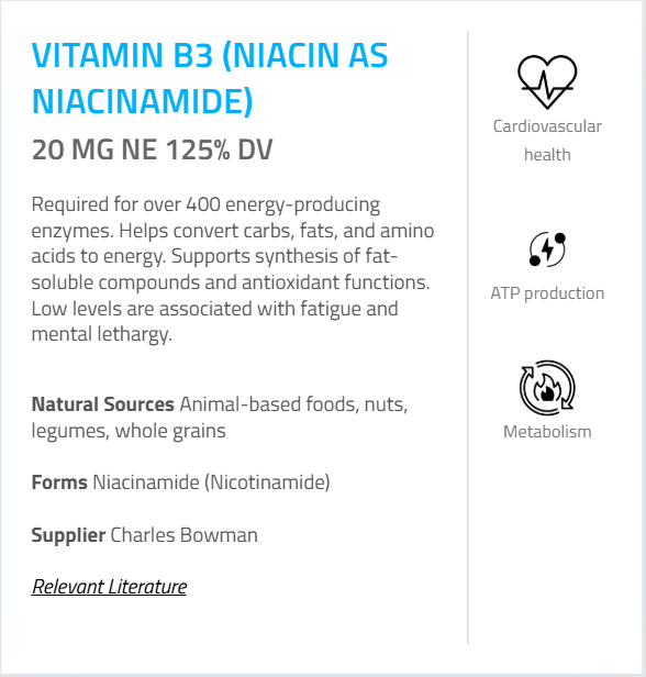 - Niacin (as Niacinamide) – 20 mg NE (125%)