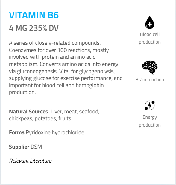- Vitamin B6 (as Pyridoxine Hydrochloride) – 4 mg (235%)