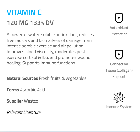 - Vitamin C (as Ascorbic Acid) – 120 mg (133%)