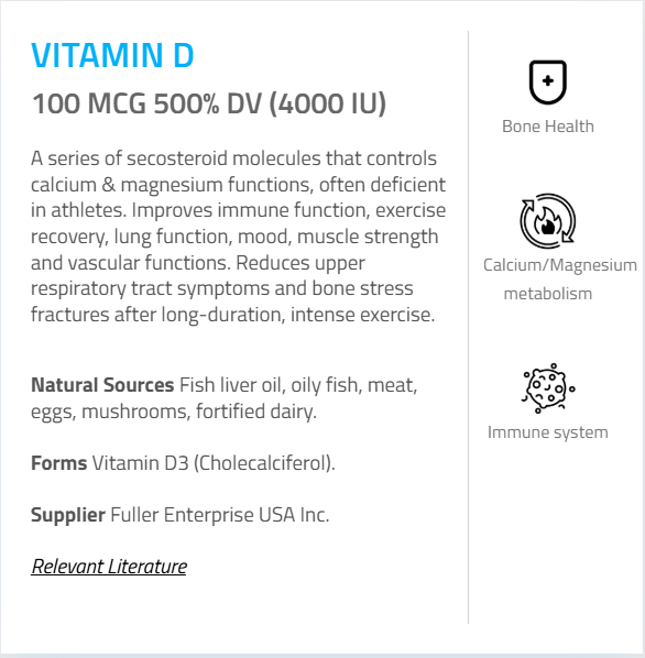 - Vitamin D (as Cholecalciferol) – 100 mcg (4000 IU) (500%)
