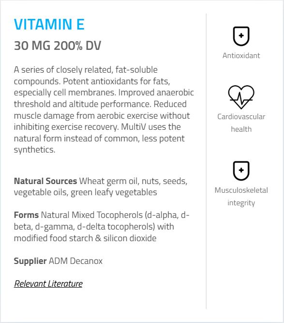 - Vitamin E (as Alpha Tocopherol from Mixed Tocopherols) – 30 mg (200%)