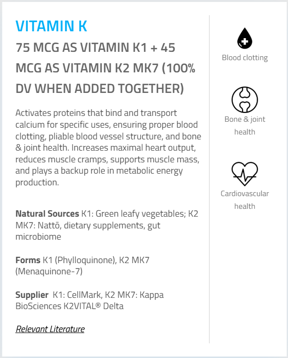- Vitamin K (as Phylloquinone and Menaquinone MK-7) – 120 mcg (100%)