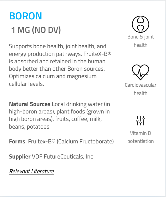- Boron (as FruteX-B® Calcium Fructoborate) – 1 mg