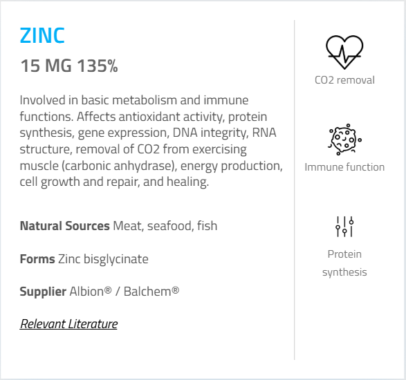 - Zinc (as Bisglycinate) – 15 mg (135%)