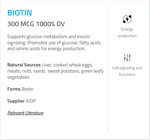 - Biotin – 300 mcg (1000%)