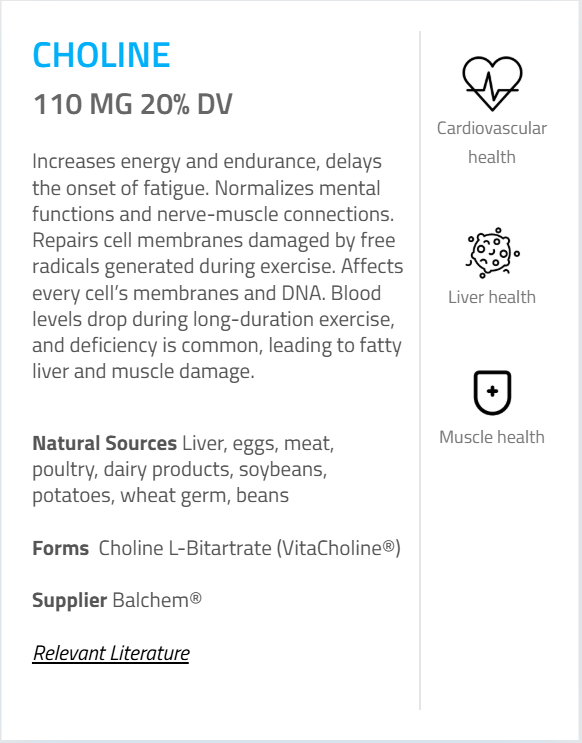 - Choline (as Choline-L-Bitartrate) (VitaCholine®) – 110 mg (20%)