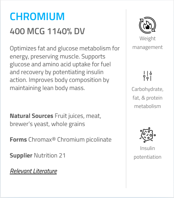 clinically-tested intakes of chromium to maximize chromium status, improving glucose delivery to working muscles.