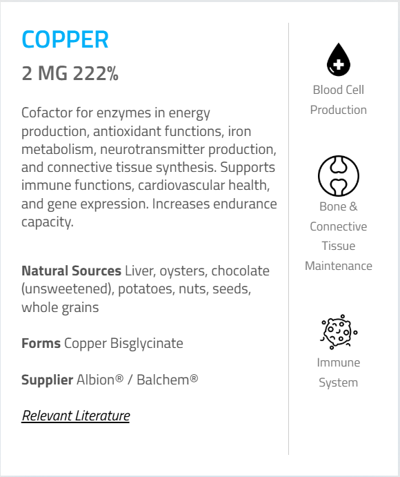 - Copper (as Bisglycinate) – 2 mg (222%)
