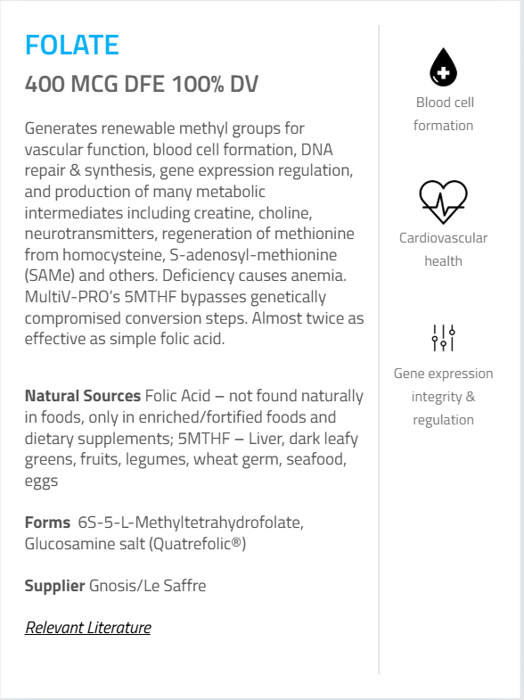 - Folate (as 5-L-Methyltetrahydrofolate, Glucosamine Salt) (Quatrefolic®) – 400 mcg DFE (100%)