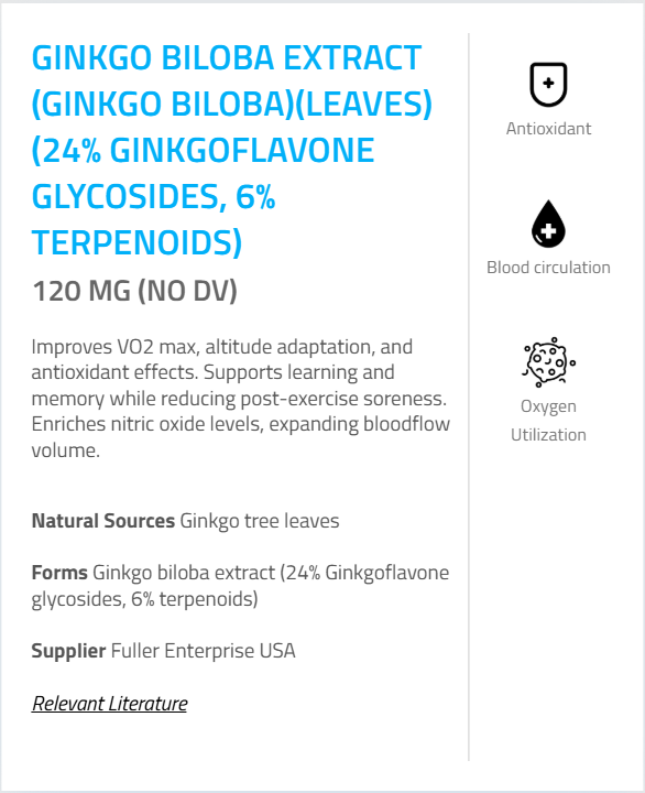 - Ginkgo Extract (Ginkgo biloba) (leaf) (24% Ginkgoflavone glycosides, 6% terpene lactones) – 120 mg