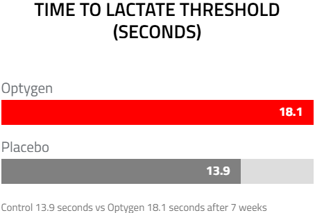 In a clinical study, Optygen increased time to the lactate threshold by 30%, even in highly trained distance runners. When you’re on the limit, that can make all the difference during repeated attacks or when the elastic is stretching and every moment could see it snap. Optygen turns the lactate threshold into a weapon for you – and a weakness for your competition.